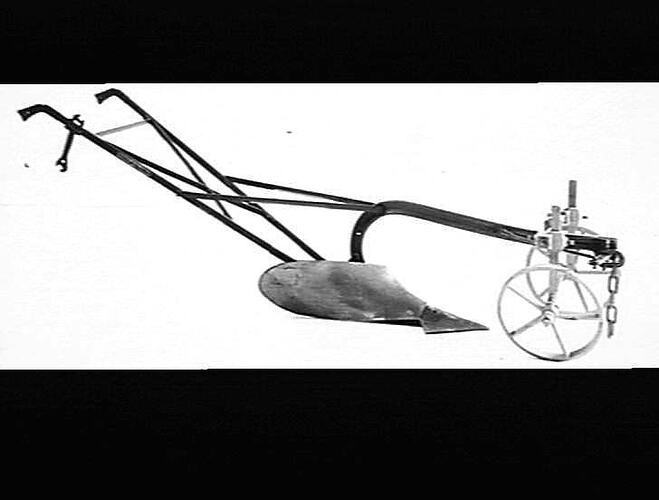 A horse-drawn 'Sunbeam' single-furrow mouldboard plough fitted with dual wheel forecarriage.