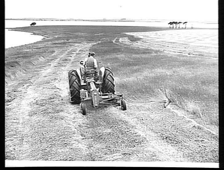 "NO. 352. HARVESTING MEADOW HAY ON THE SHORES OF LAKE BURRUMBEET. A SUNSHINE POWER-DRIVE MOWER COUPLED TO SUNSHINE MASSEY HARRIS TRACTOR CUTTING A HEAVY CROP OF WIMMERA RYE GRASS ON MR. T. DOBSON'S FARM, BURRUMBEET, VIC. DECEMBER, 1949."