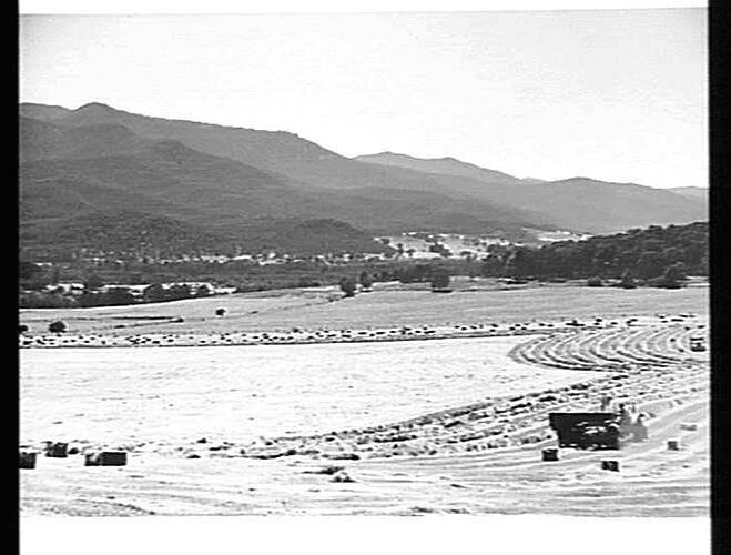"NO. 361. SCENIC SPLENDOUR. A SUNSHINE PICKUP BALER BALING MEADOW HAY AT POREPUNKAH, NORTH EASTERN VICTORIA. DECEMBER, 1949."