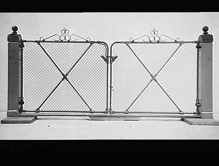 Black and white photograph of a garden gate no. 24C. The H.V. McKay gates were constructed from steel tube with cast iron joiners and fasteners, all made in the Sunshine factory. Note that on top of the gate post is a fine example of the cast brass 'Sunshine harvester' cap (with a ball added).