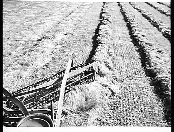 NO. 475. THIS PHOTOGRAPH SHOWS CLEARLY THE CLEAN JOB OF RAKING DONE BY THE SUNSHINE POWER DRIVE SIDE DELIVERY RAKE ON THE FARM OF MR. W. R. TALBOT, GEELONG, VIC. DEC. 1953.