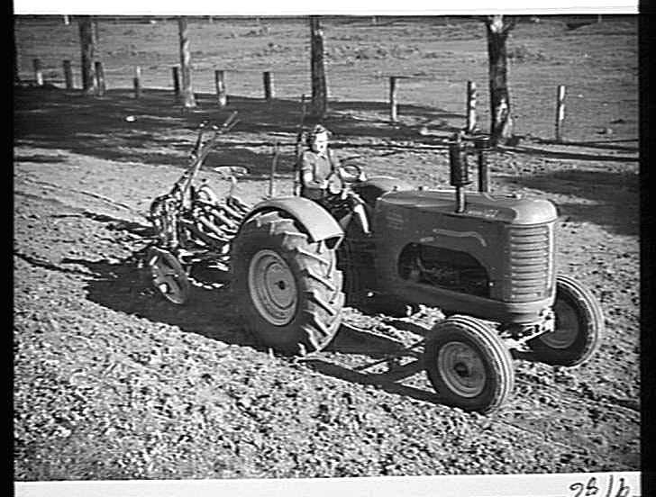 Photo shows Mrs Ina Jackson driving a Massey-Harris Model '102' tractor, pulling a'Sundercut' 10 disc cultivator.