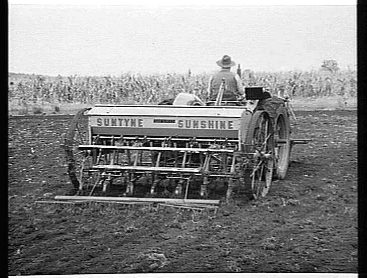 12-ROW 500 SERIES COMBINED GRAIN AND FERTILIZER DRILL AND SPRING TINE CULTIVATOR WITH STUMP JUMP SMOOTHING HARROWS BEHIND, SOWING GRAIN ON THE FARM OF MR. A. R. ELWOOD, KINGAROY, QUEENSLAND.: MAY 1952