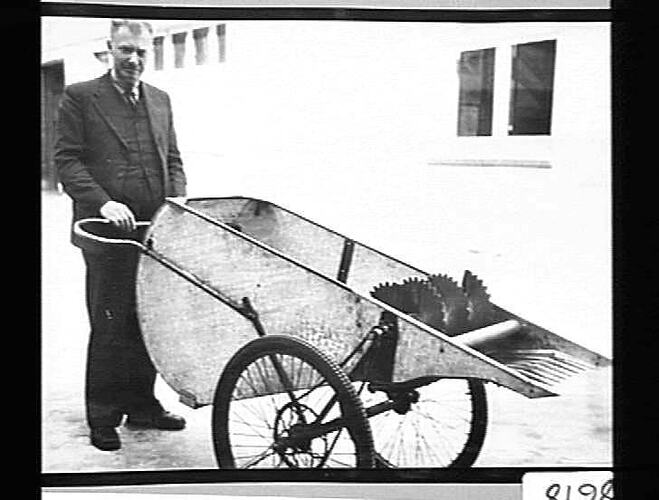 Mr Shea is shown here with a harvesting machine designed by Mr Headlie Taylor. 'Ergot' is a growth on rye grass and was processed and used as a preservative for meat, etc. During the 1939/45 war.'Ergot' was previously imported from Japan. The machine.