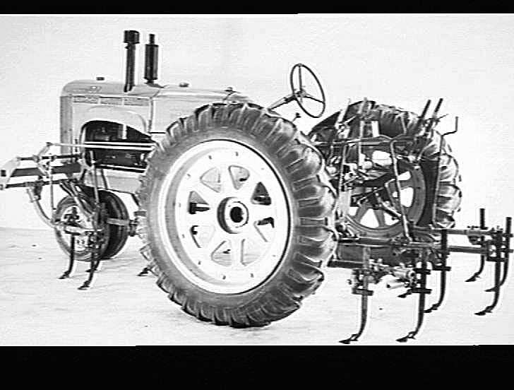 PHOTO OF A '102' ROW-CROP TRACTOR SET-UP WITH FRONT AND REAR RIGID TYNES WITH REPLACEABLE EARTH-ENGAGING POINTS. THESE IMPLEMENTS ARE RAISED AND LOWERED BY HAND-OPERATED LEVERS.