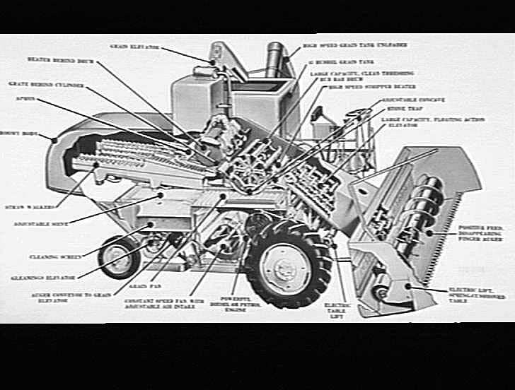 A descriptive sectional view of the working parts and threshing mechanism of a Model 780 self-propelled header imported from England.