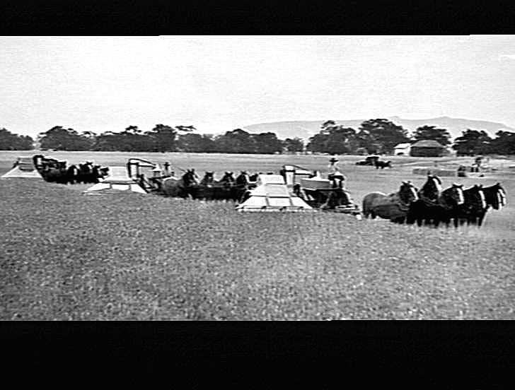 Three model 'A.L.' ground-drive Sunshine harvesters, drawn by six-horse-abreast teams.