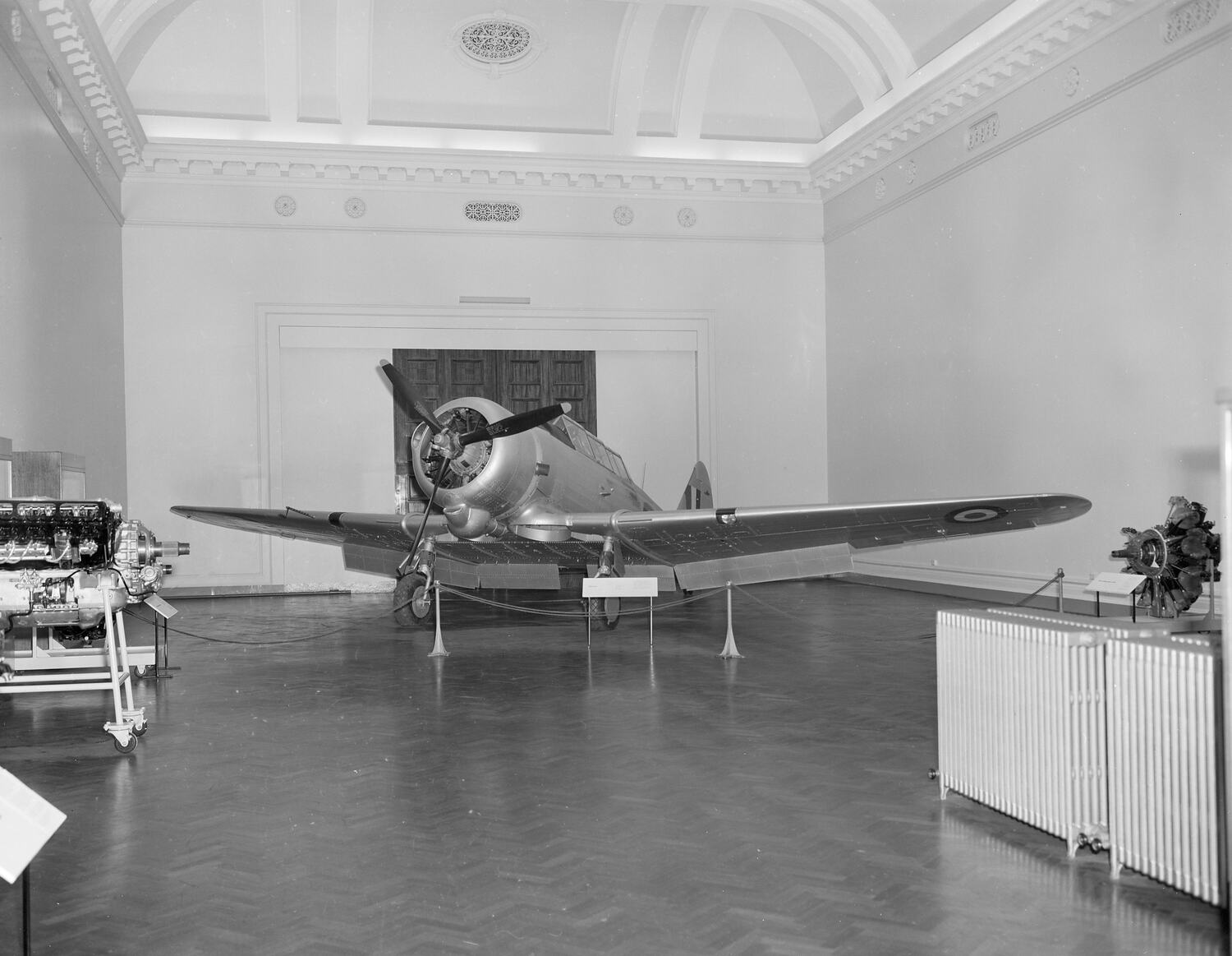 Negative copy of photograph showing the CAC 'Wirraway' at the Science Museum of Victoria, May1970. 'Wirraway' was a general purpose and training aircraft used during World War II. It was displayed in McArthur Hall in the Swanston Street building, alongside the Duigan Biplane and aircraft models.