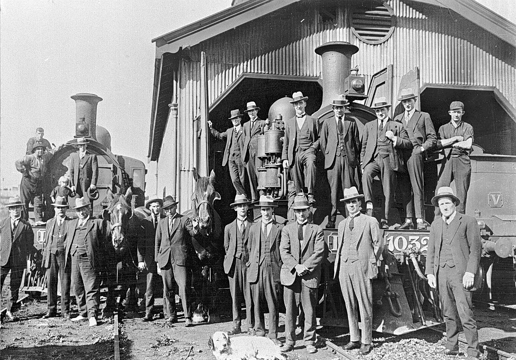 Loco crew members and railway engineers posed with three locomotives at Portland loco depot. The engineers all wear suits and hats. Two horses and a dog are also posed. The tender of a V-class locomotive is visible, and two Dd-class locomotives are visible in front view.