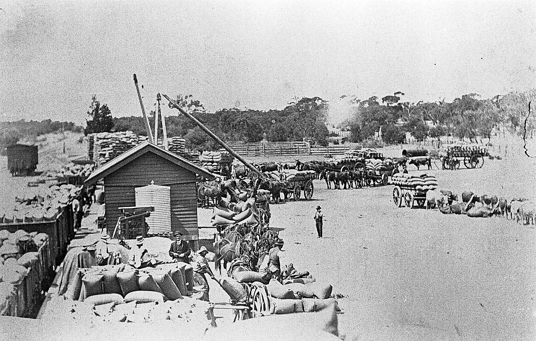 Agricultural Produce, Bullock Teams, Cereal Crops, Drays & Wagons, Horsedrawn Vehicles, Railway Rollingstock, Railway Yards, Sacks, Winches, Workers