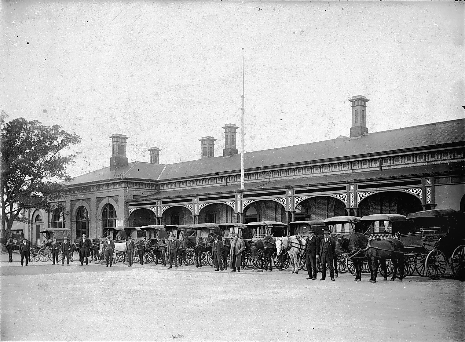 Coaches, Drivers, Horsedrawn Vehicles, Public Transport, Railway Stations, Taxis, Verandahs, Workers