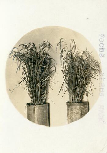 Written in pencil on rear of postcard: 'Rice plants grown by J. Takasuka, / Tyntynder W., near Swan Hill, Vict., / see specs. 3770, 3771, 3773'. Stamped on front of postcard: 'FOODS SEEDS RICE'