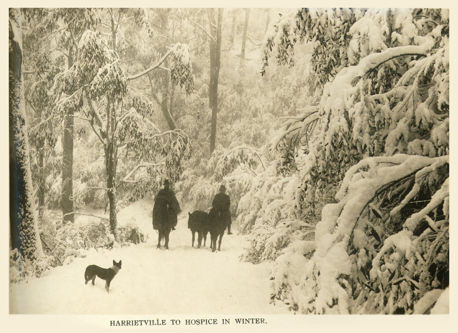 Harrietville to hospice in winter. Two men on horseback, with third horse and dog.