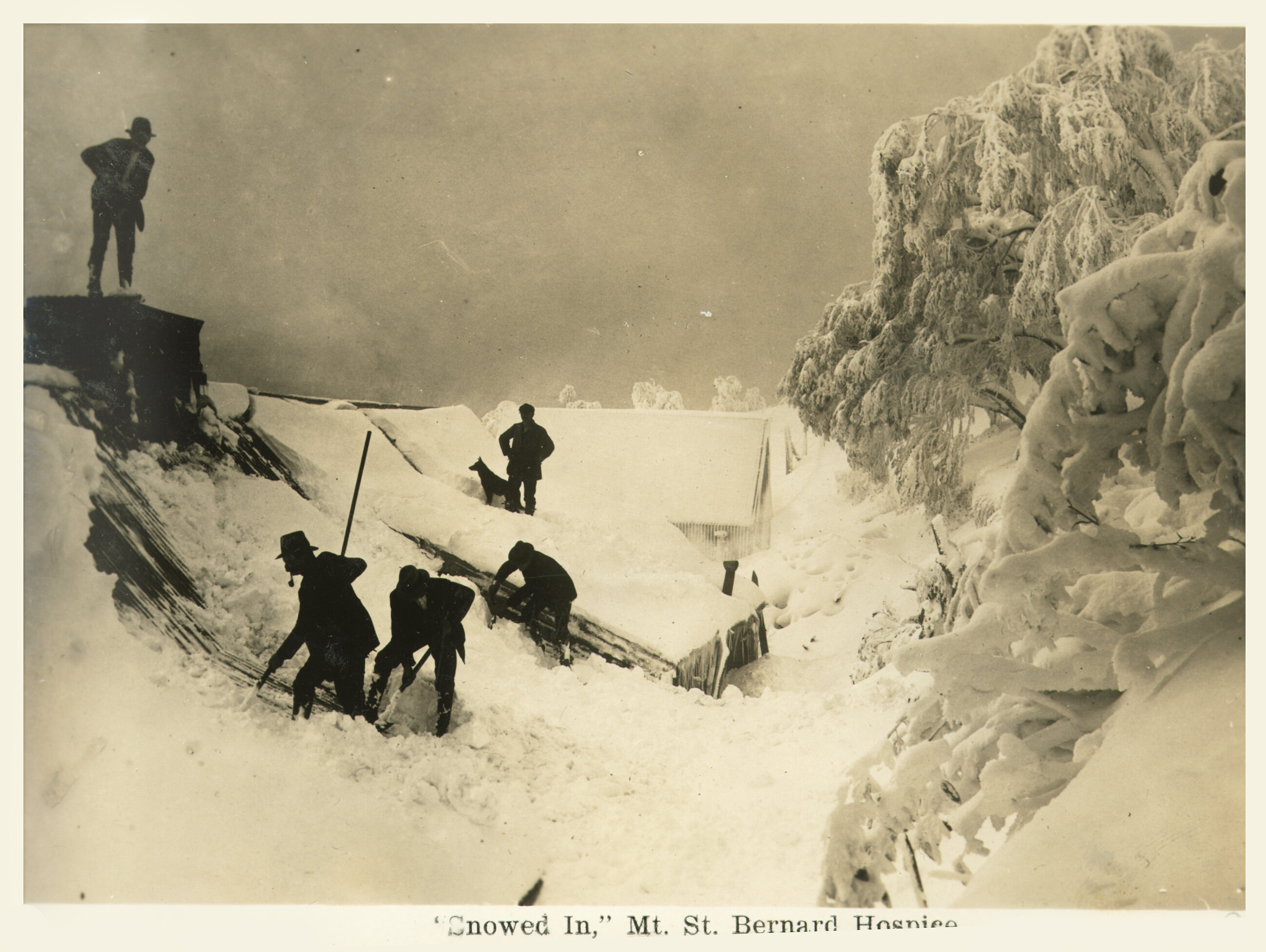 'Snowed in', Mount St Bernard Hospice. Men clearing snow from the roof.