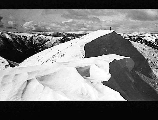 The summit, Mount Feathertop, looking towards Bogong. A climber stands on the summit.