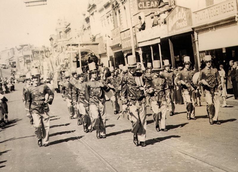 Marching men in a parade. Part of the celebrations for Ballarat Gala Day.