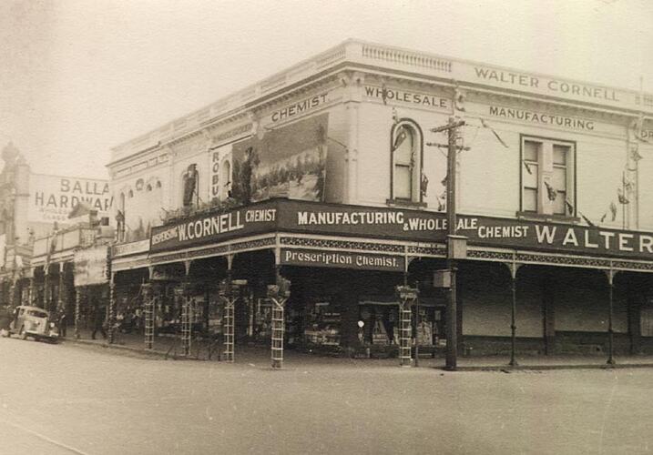 Decorated shopfronts. 'w. Cornell, Dispensing Chemist' in the foreground. Part of the celebrations for Ballarat Gala Day.