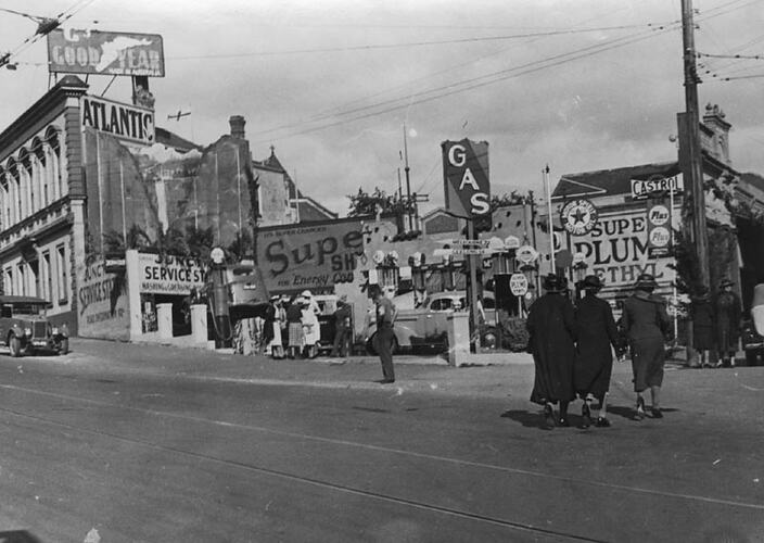 Advertising, Celebrations, Decorations, Motor Cars, Parades, Power Lines, Power Poles, Roads, Service Stations, Signage