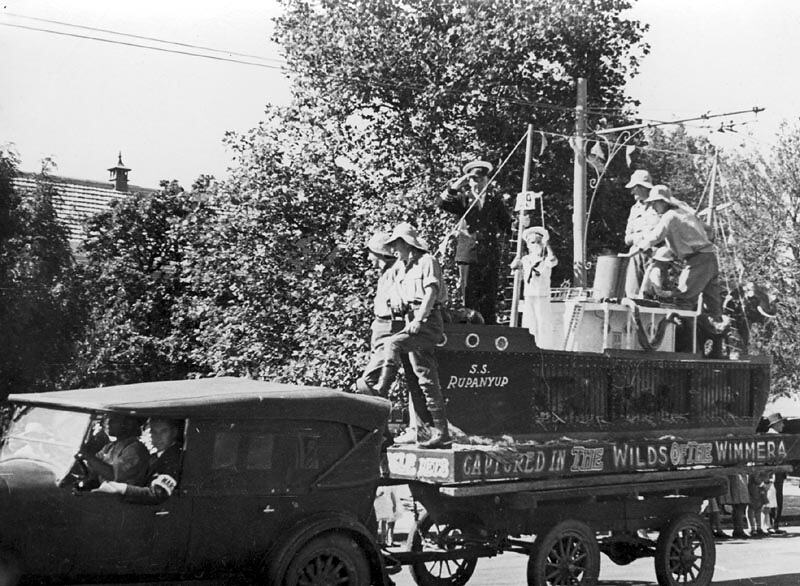 A parade float carrying a 'boat' named'S.S.Rupanyup' and with the legend'Captured in the wilds of the Wimmera'. Part of the celebrations of Ballarat Gala Day.