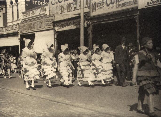 Women in fancy dress marching in a parade. Part of the celebrations for Ballarat Gala Day.