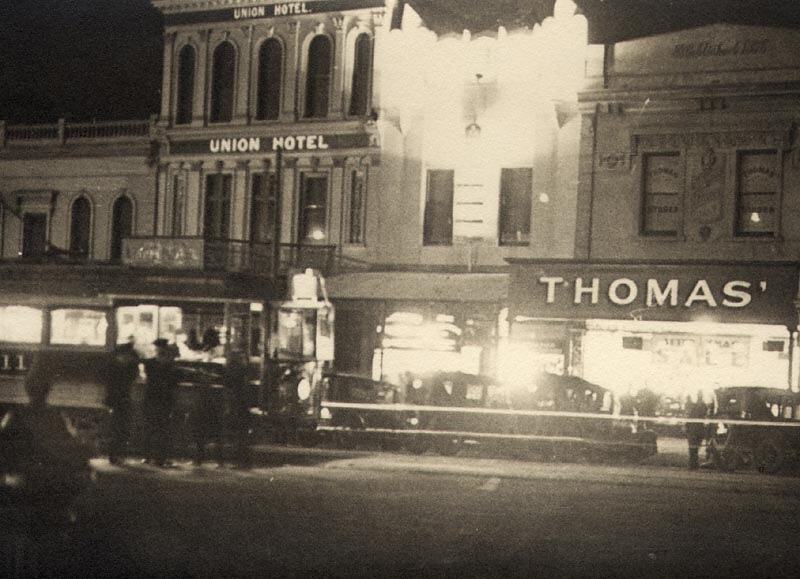 A streetscape at night, featuring several shops and the Union Hotel. An electric tram is stopped in the foreground.