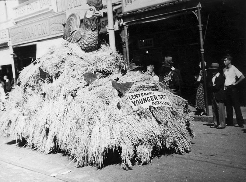 A straw covered float with a rooster on top. A sign on the front reads 'centenary younger set auxiliary'. Part of the celebrations for Ballarat Centenary Day.