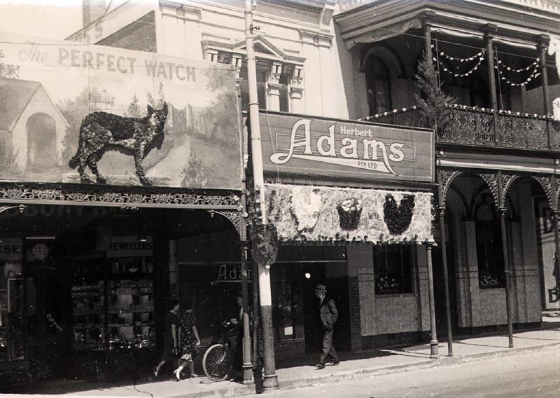 Decorated shopfronts. A jeweller, on the left, displays a watchdog outside a kennel (see also cn120). 'Herbert Adams', next door, displays hens and a basket of (eggs?). There is a hotel on the right. Part of the celebrations for Ballarat Gala Day.
