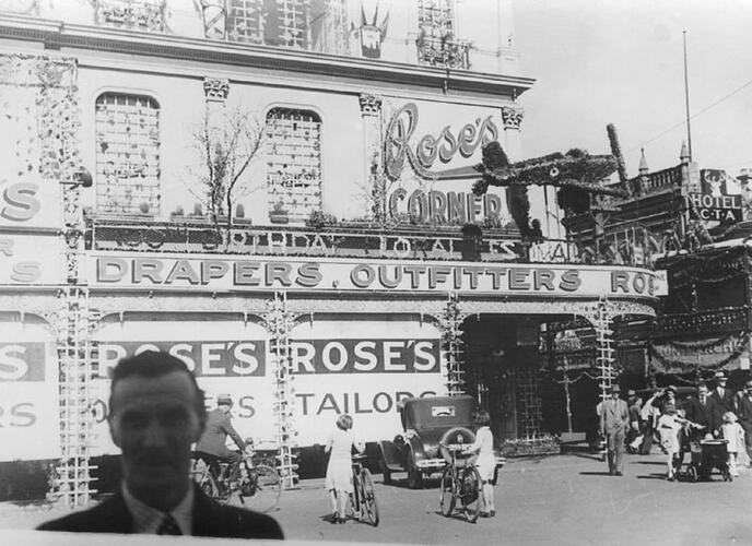 Decorations on 'Rose's Corner Store'. The display features an aeroplane. Two girls with bicycles look at the display and a man in the foreground look at the photographer. Part of the celebrations for Ballarat Gala Day. (see also cn73,109,121,131,135).