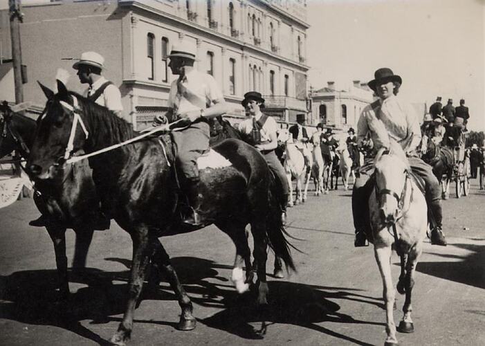 A group of horse riders and a stage coach participating in a parade. Part of the celebrations for Ballarat Gala Day.