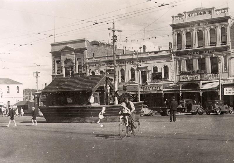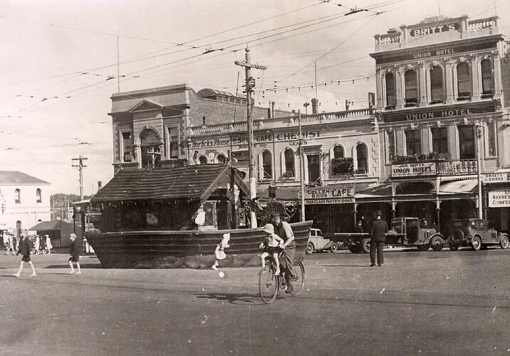 Decorated shopfronts and street furniture, including a tram shelter decorated as Noah's ark. The 'Union Hotel' is in the background. Part of the celebrations for Ballarat Gala Day. (see also cn121,131,173).