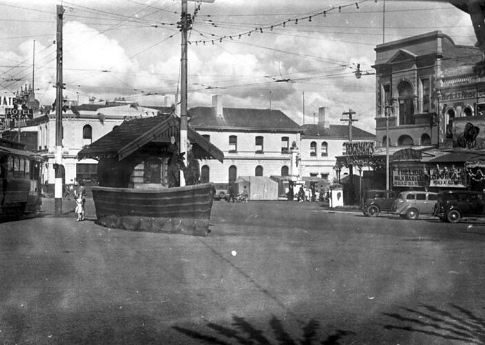 Advertising, Celebrations, Decorations, Electric Trams, Hotels, Motor Cars, Parades, Power Lines, Shops, Tram Shelters