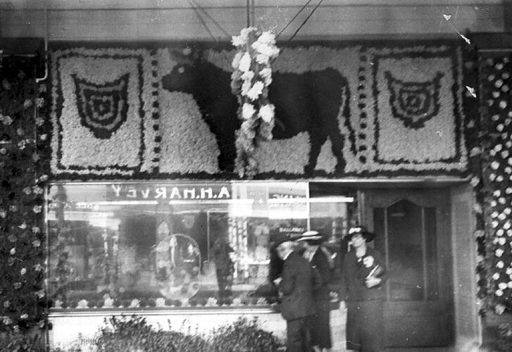 People in front of a butcher 's shop displaying a floral bull. Reflections in the window show the name'A.H.Harvey'. Part of the celebrations for Ballarat Gala Day.