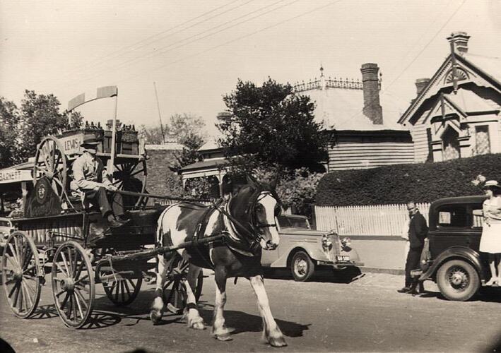 Advertising, Celebrations, Drays & Wagons, Horsedrawn Vehicles, Horses, Motor Cars, Parade Floats, Parades, Shops