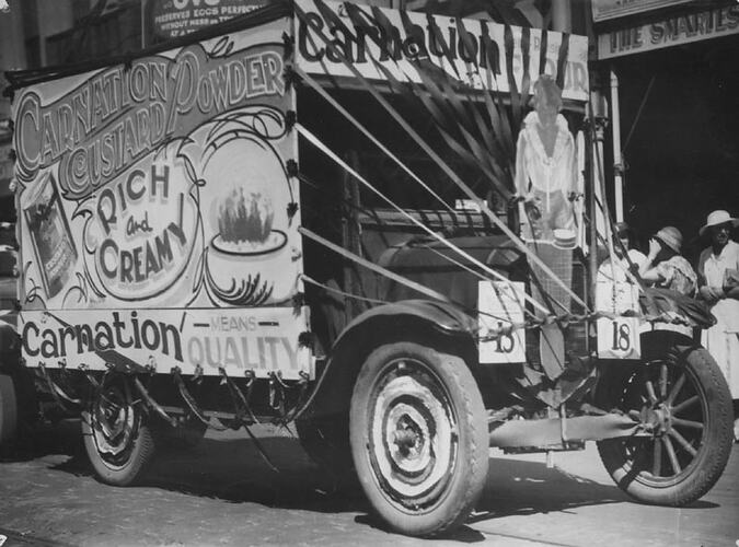 A parade float featuring 'Carnation Custard Powder'. Part of the celebrations for Ballarat Gala Day.