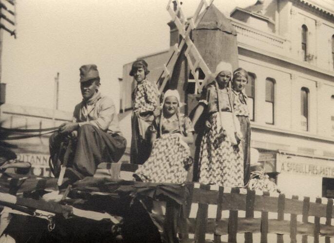 A parade float featuring a windmill and children dressed in Dutch costumes. Part of the celebrations for Ballarat Gala Day. (see also cn187).