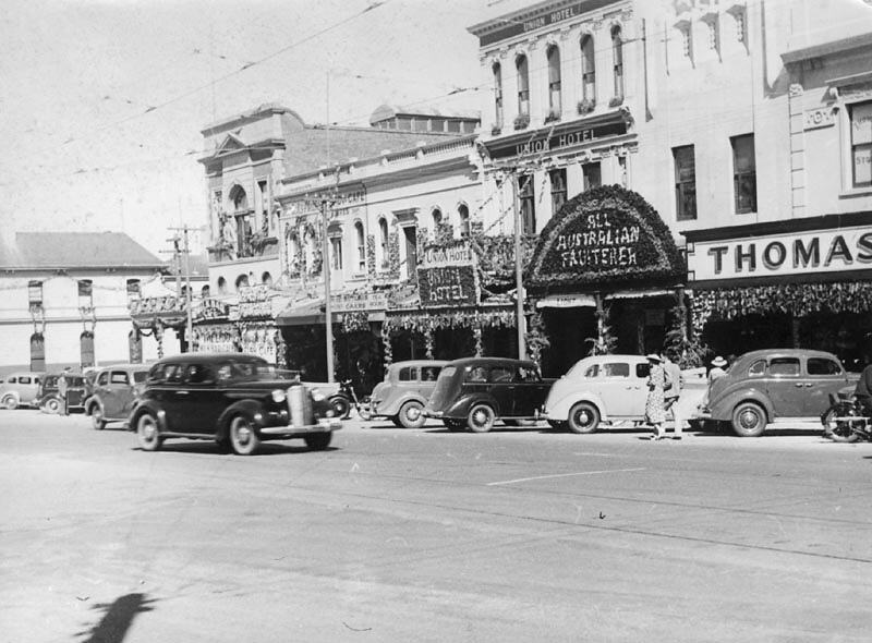 Decorated shopfronts, including the 'Union Hotel' and the'All Australian Fruiterer'. Part of the celebrations for Ballarat Gala Day.