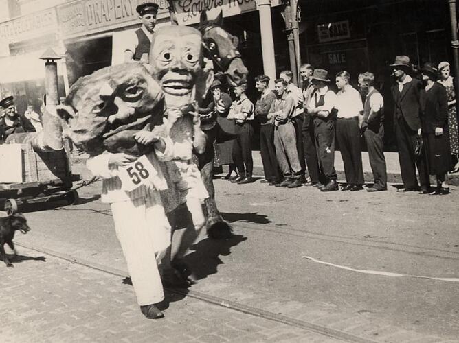 Celebrations, Fancy Dress Costumes, Horse Riding, Horses, Masks, Parade Floats, Parades, Shops, Spectators