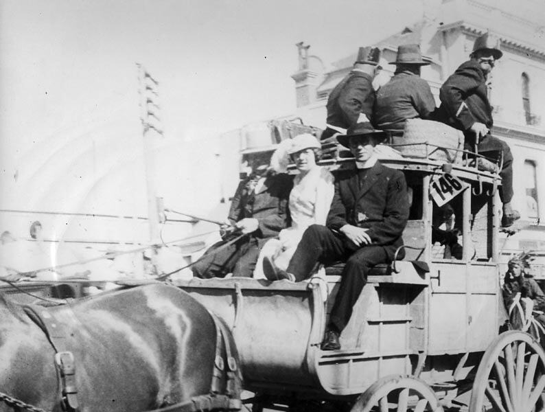 A stagecoach float. Passengers include a man dressed as a policeman and another as a priest Part of the celebrations for Ballarat Gala Day. (a smaller print appears at cn58).