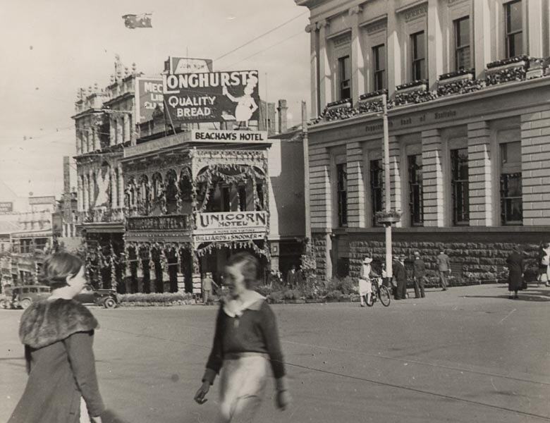 Decorated buildings, including Beacham 's Unicorn Hotel and the Commonwealth Bank. Two girls in the foreground are crossing the street. Part of the celebrations for Ballarat Gala Day,.