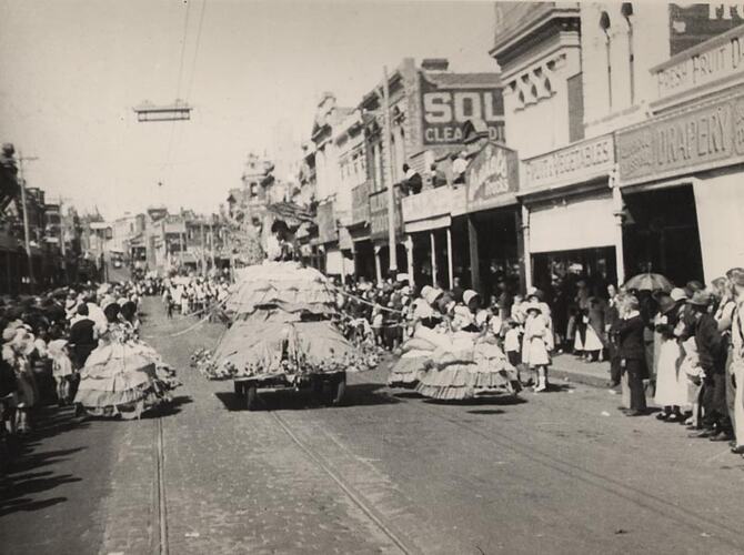 Women in crinolines accompanying a float with another woman similarly clothed. Part of the celebrations for Ballarat Gala Day. There is a smaller print at cn130. (see also cn44).
