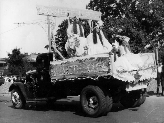 A parade float promoting 'Nazareth House', featuring a group of girls dressed as the southern cross constellation. Part of the celebrations for Ballarat Gala Day.