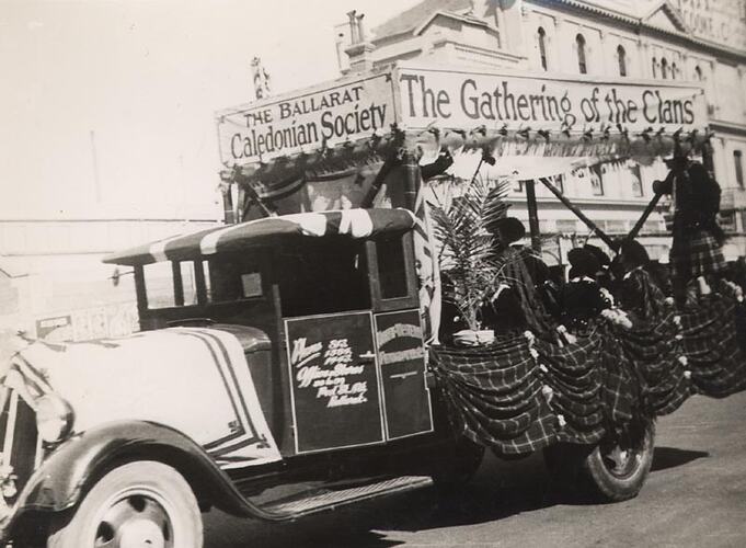 A float festooned tartan and with 'Ballarat Caledonian Society' and'the gathering of the clans' displayed. Part of the celebrations for Ballarat Gala Day.
