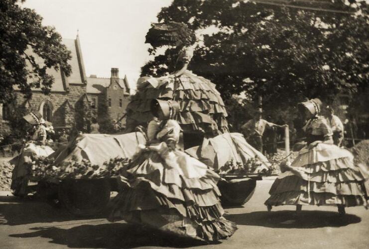 Women in crinolines accompanying a float with another woman similarly clothed. Part of the celebrations for Ballarat Gala Day. See also cn130.