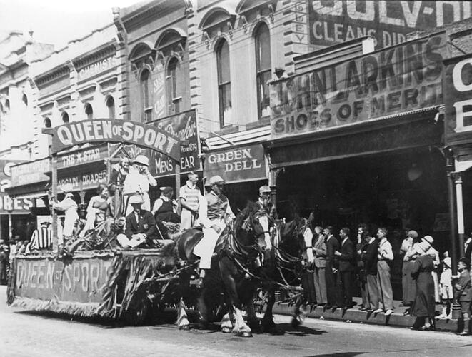 A horse-drawn float with the sign 'Queen Of Sport'. The float carries both men and women and refers, perhaps, to Ballarat. Part of the celebrations for the Ballarat Gala Day.
