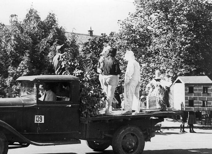 Three persons dressed as animals (possibly as the three little pigs and the wolf) on a parade float. Part of the celebrations for Ballarat Gala Day. (see also cn28, 53).