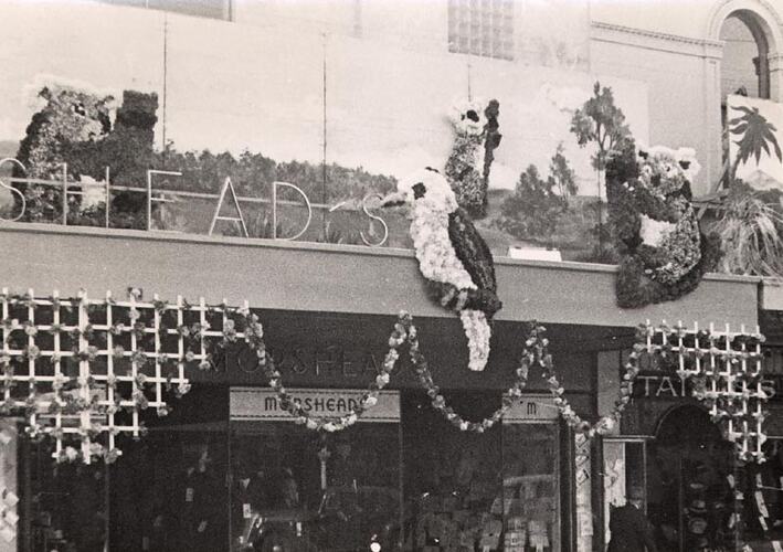 Decorated shop fronts, including floral koalas and kookaburras. Part of the celebrations for Ballarat Gala Day.