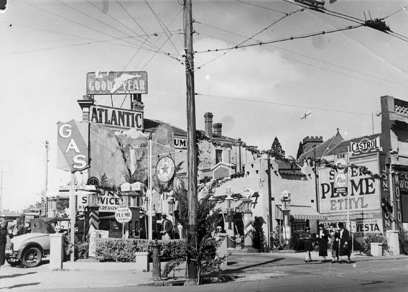 Advertising, Billboards, Celebrations, Decorations, Motor Cars, Parades, Petrol Pumps, Petroleum, Power Lines, Roads, Service Stations, Shops
