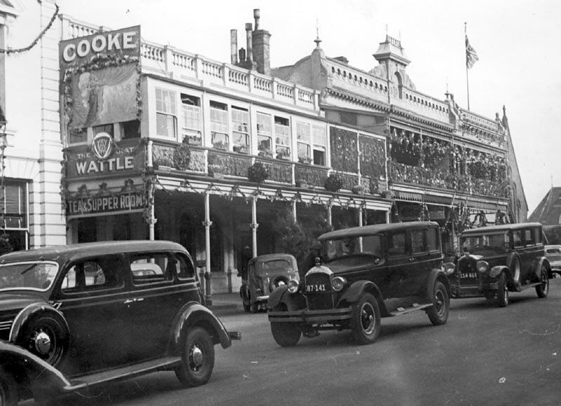 Advertising, Celebrations, Decorations, Flags, Motor Cars, Parades, Roads, Streetscapes, Verandahs