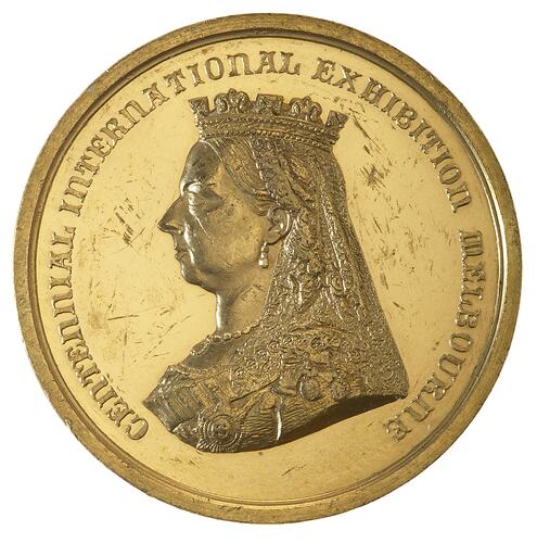 The gold medal of the Centennial International Exhibition featuring a bust of Queen Victoria facing left wearing crown and veil and a Victor's wreath of wattle and oak around the Southern Cross and the motto in Latin "To the deserving arts, distinguished honour"