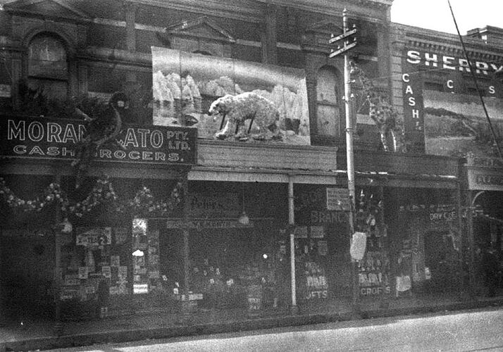 Decorated shopfronts. 'Moran & Cato' display a parrot on their awning while the unidentified shop adjoining displays a polar bear amid icebergs. Part of the celebrationis for Ballarat Gala Day.